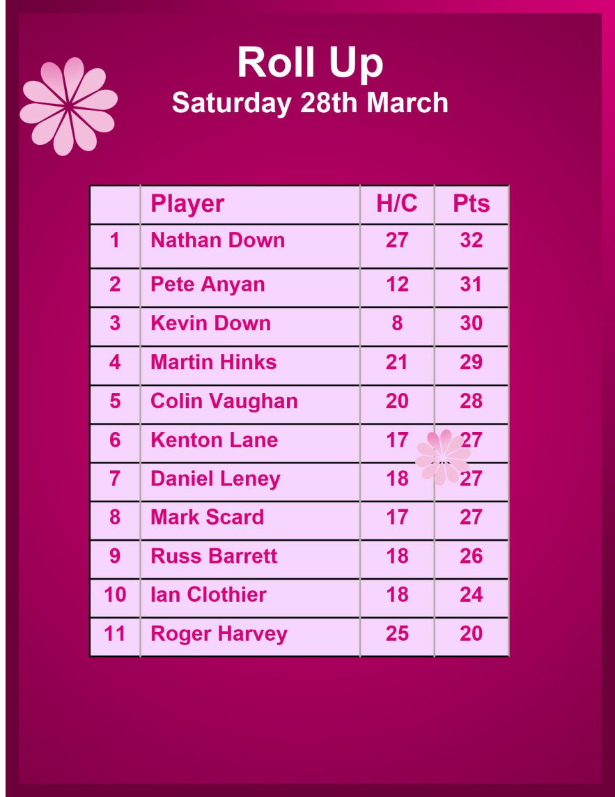 Saturday 28th March - Roll Up: Won by Nathan Down with 32 Points. See Table below