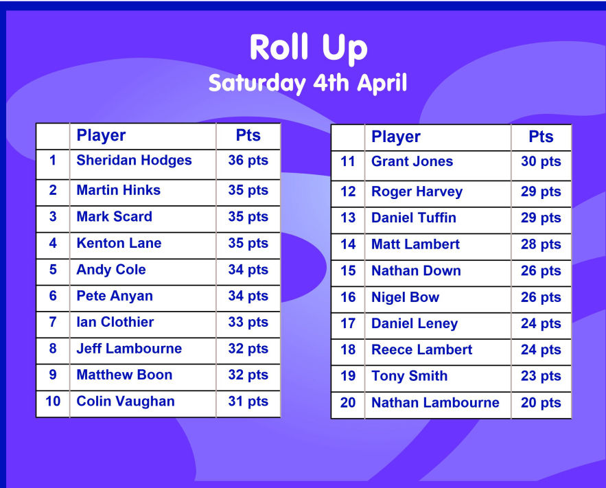 Saturday 4th April - Roll Up: Won by Sheridan Hodges with 36 points. See Table below.