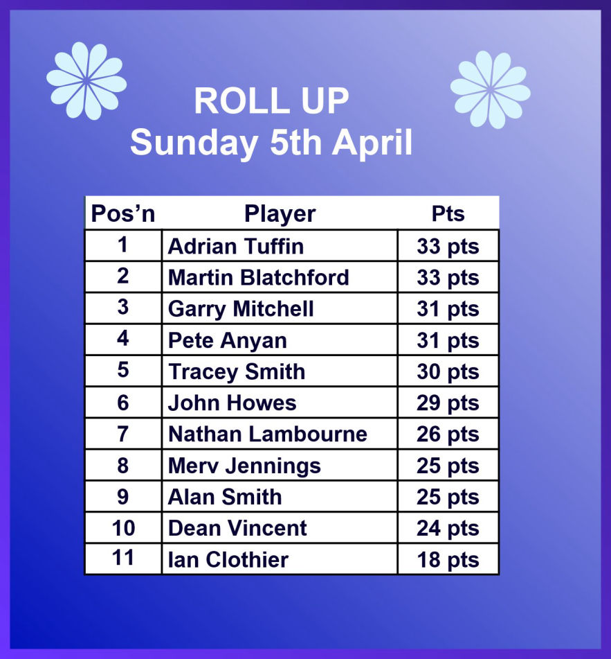 Sunday 5th April - Roll Up: Won by Adrian Tuffin with 33 points. See Table Below.