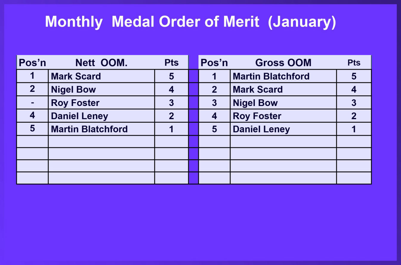 Latest competition winners and OOM Tables for the 2026 Monthly (Sunday) Medal are shown below. The Weekday medal and Tiger Trophy results and Orders of Merit are shown on the Senior page.