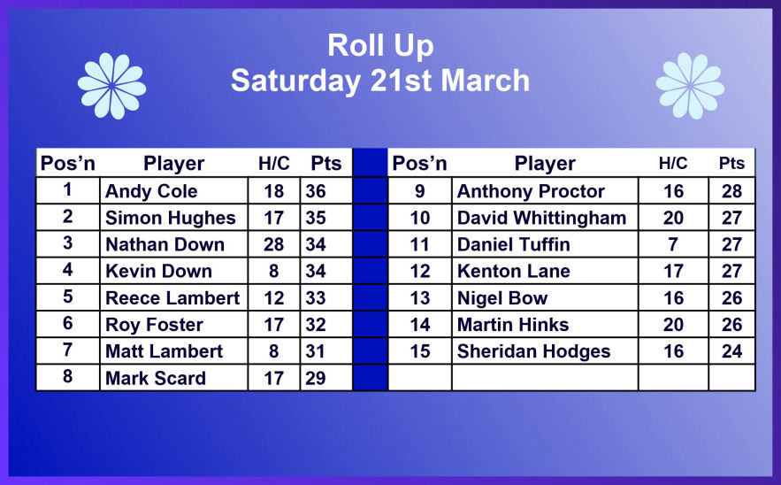 Saturday 21st March - Roll Up: Won by Andy Cole with 36 points. See the Result Table below.