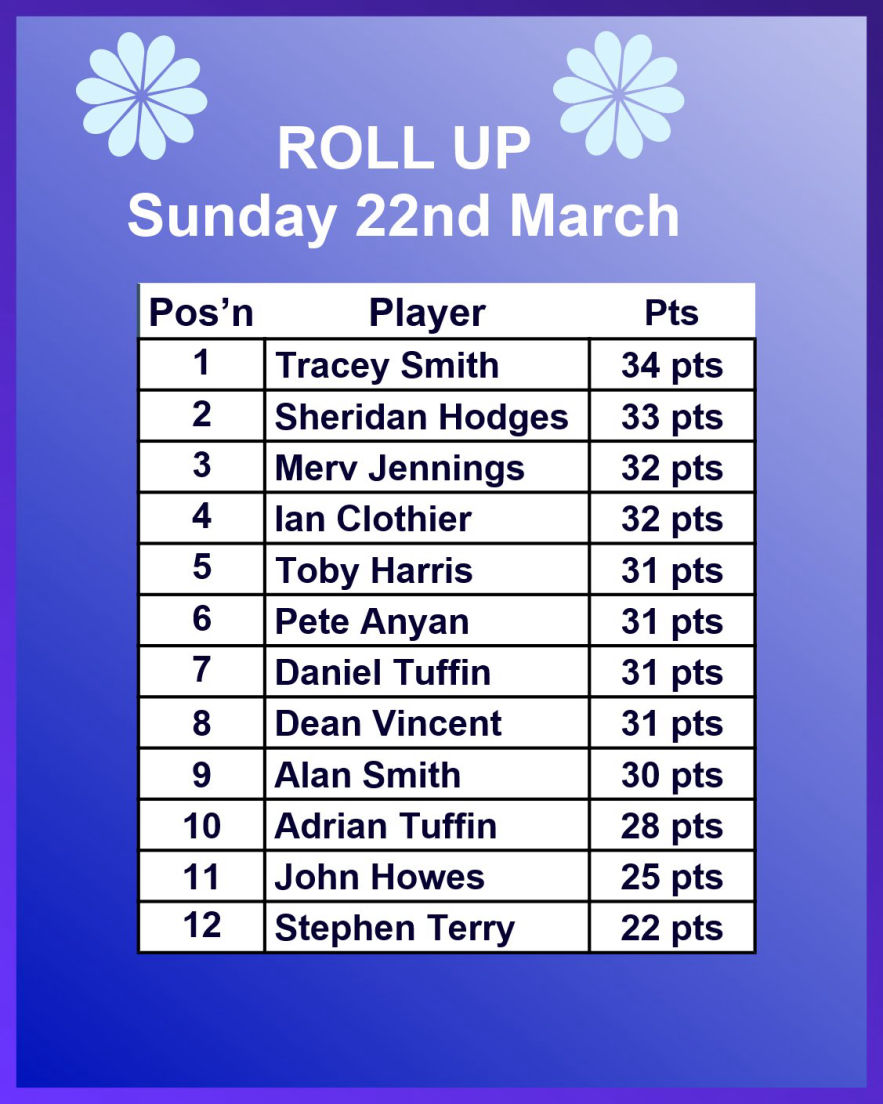 Sunday 22nd March - Roll Up: Won by Tracy Smith with 34 points. See the Result Table below.