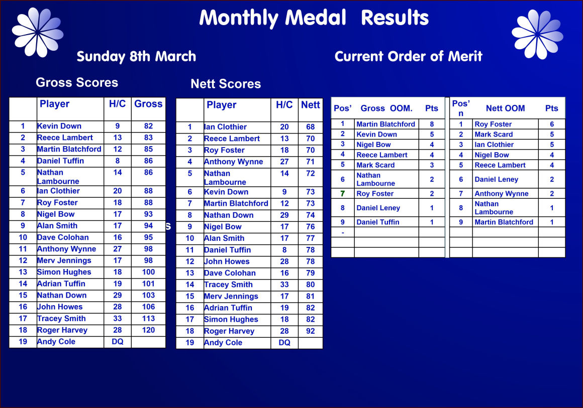 Sunday 8th March - Medal: Won by Kevin Down (Gross 82) and Ian Clothier (Nett 68). See the full results and Order of Merit in the panel below.