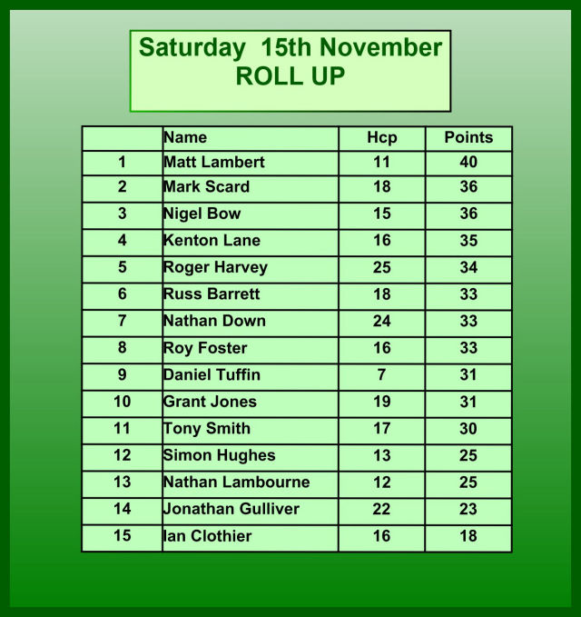 Saturday 15th November - Roll Up: Won by Matt Lambert with 40 points. See the Results Table below.