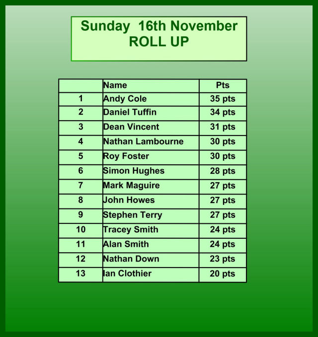 Sunday 2nd November - Roll Up: 1st Alan Smith (37), 2nd Dean Furzy (35), 3rd John Howes (29), 4th Nathan Lambourne (24).