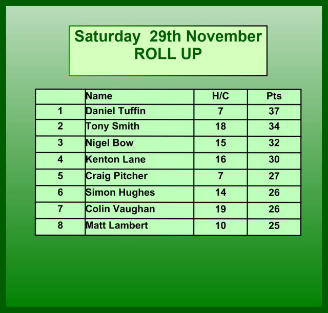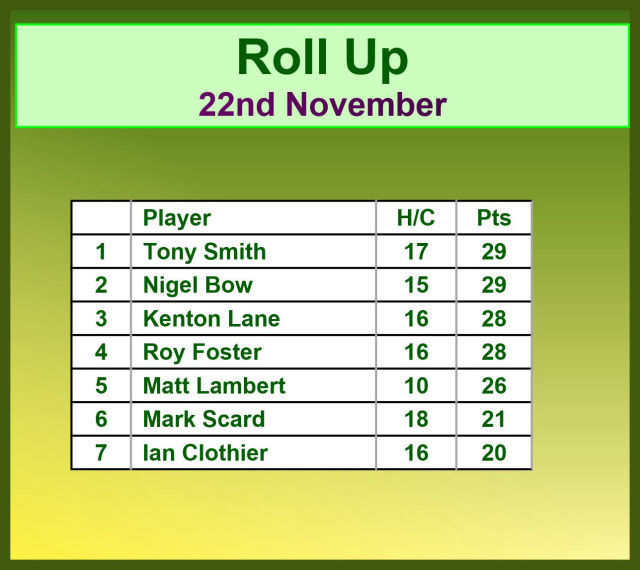 Saturday 22nd November - Roll Up: Won by Tony Smith with 29 points. See the Result Table below.