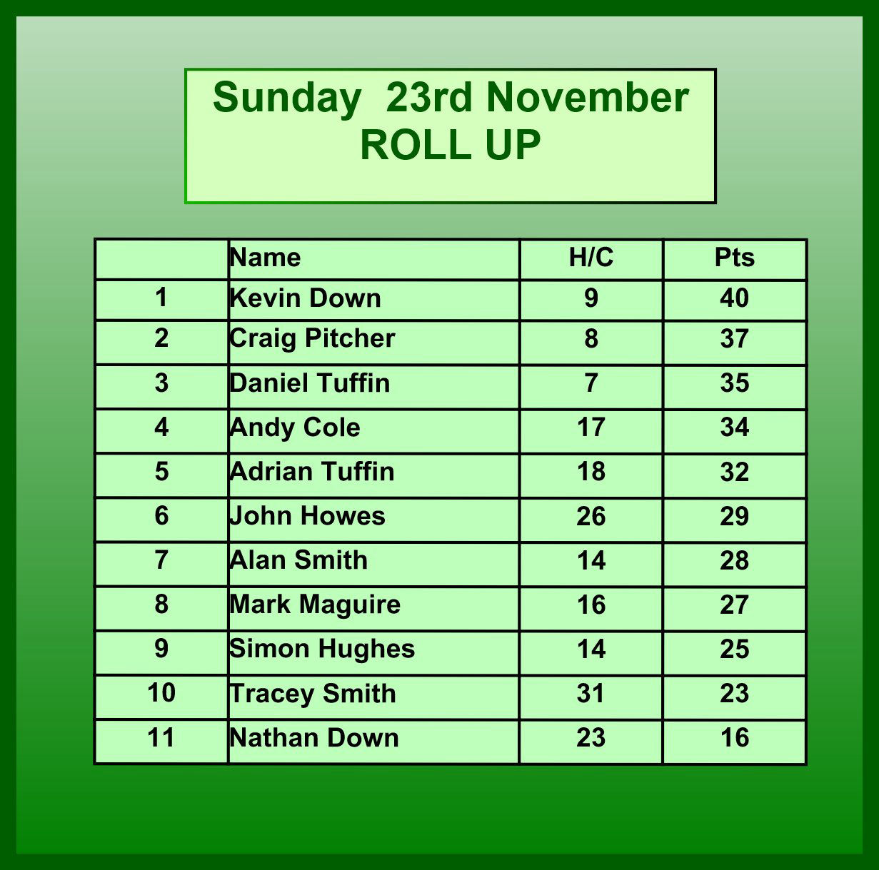 Sunday 23rd November - Roll Up: Won by Kevin Down with 40 points. See the Result Table below.