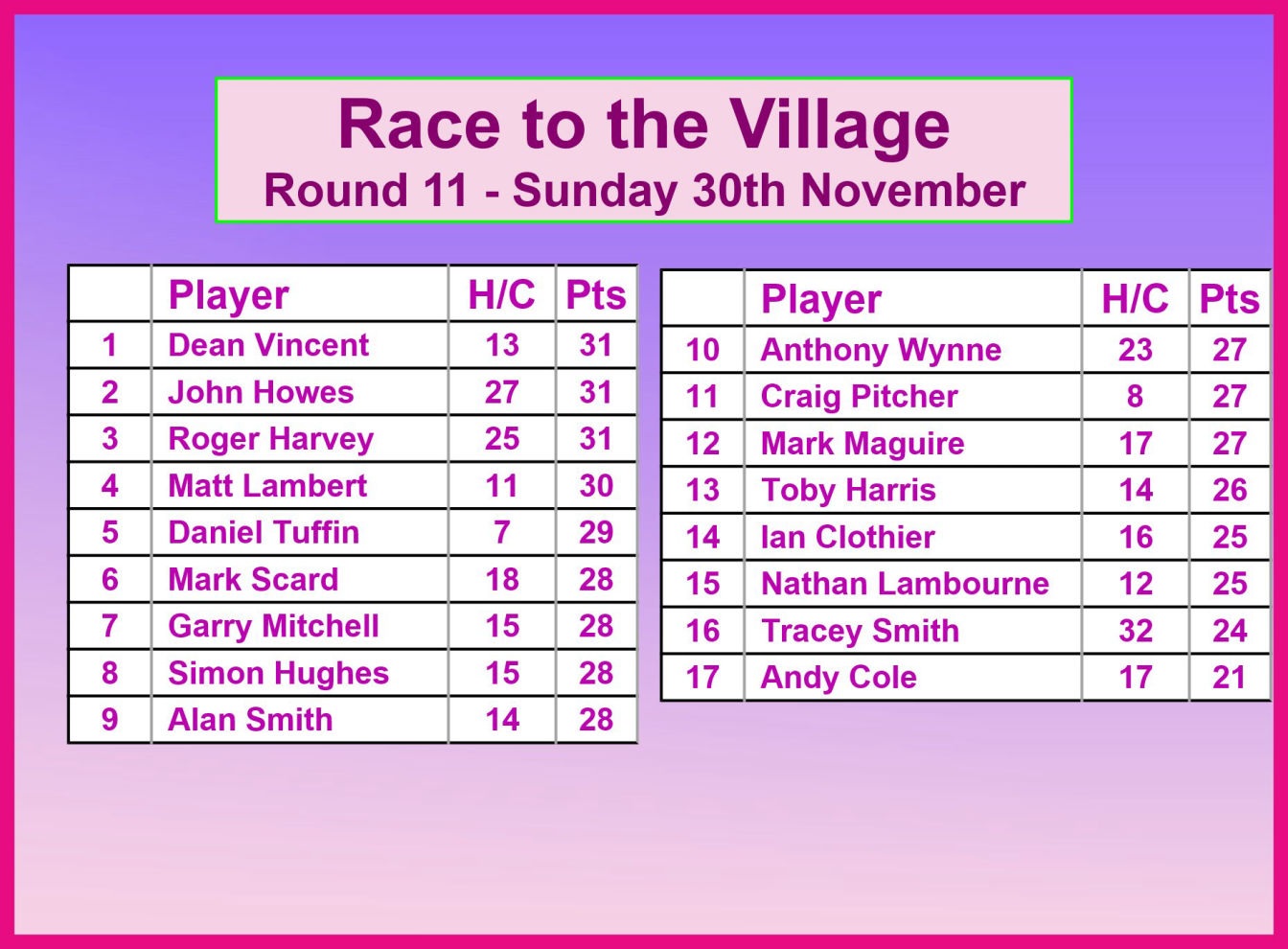 Sunday 30th November - RTTV: Won on countback by Dean Vincent with 31 points. See panel below.