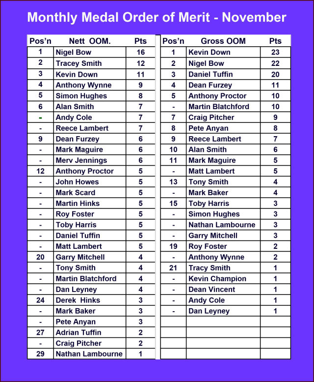 Sunday 9th November - Medal: Lowest nett - Matt Lambert (68), Lowest Gross - Martin Blatchford (78). See the Result and OOM Tables below.