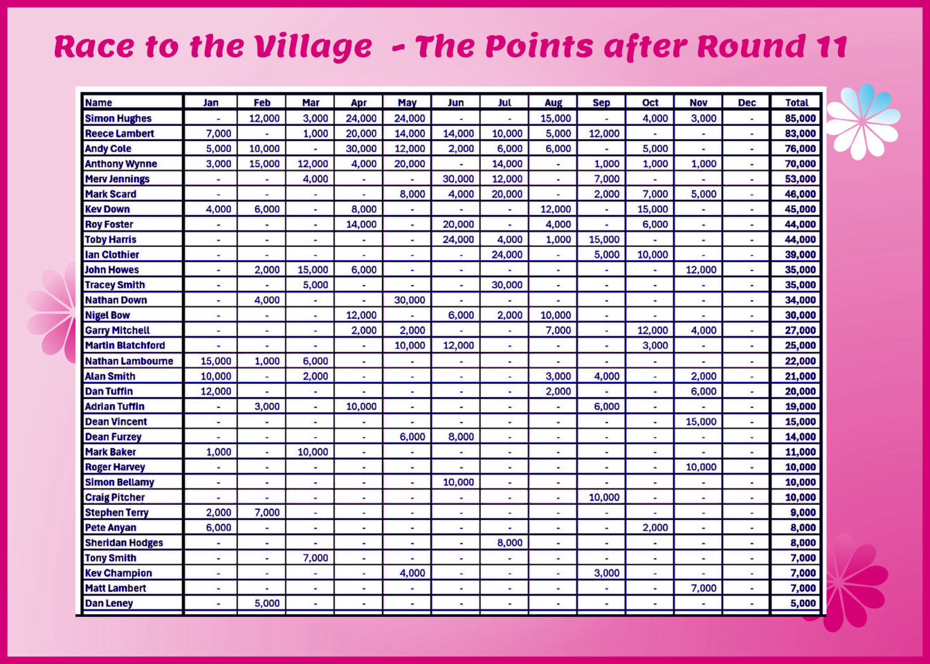 Sunday 16th November - Roll Up: Won by Andy Cole with 35 points.