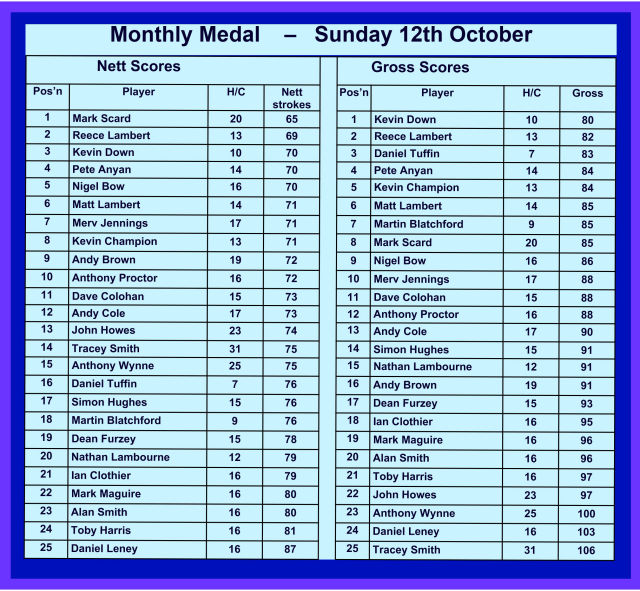 Sunday 12th October - Medal: Won by Mark Scard (Nett 65) and Kevin Down (gross 80). See Results and OOM Tables below.