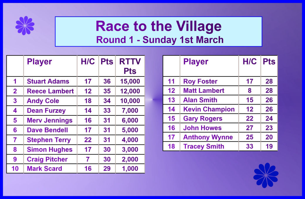 Race to the Village 2026 is go go go and off to a hot start on his RTTV debut was Stuart Adams winning with 1 birdie, 4 pars, 10 bogeys and 36 Stableford points . In a close 2nd Reece Lambert after playing an excellent front 9 and overall great round scoring 35 points. In 3rd myself with 34pts ahead of 4th Dean Furzey 33pts. In 5th Simon Hughes narrowly beating Merv Jennings, debutant Dave Bendell & Stephen Terry on countback with 31 points and in 9th Craig Pitcher with 30pts. Last but not least taking the 10th place RTTV points Mark Scard with 29pts. Honourable mention goes to Stuart, Craig and Mark for each scoring a birdie and to Reece & Craig for joint lowest gross of 84 . Thank you to everyone for getting involved, it was a great turn out of 18 players and a few new faces in the mix so welcome to all and hope to see you for Round 2 at the end of this month. Cheers!