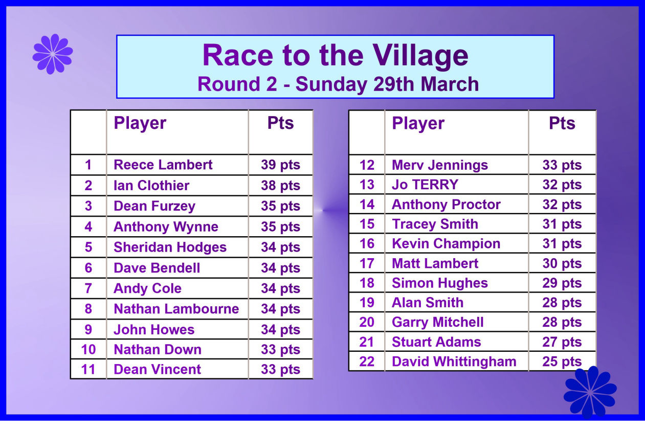 Sunday 29th March - RTTV: Won by Reece Lambert with 39 points. See the Results Panel below for details.