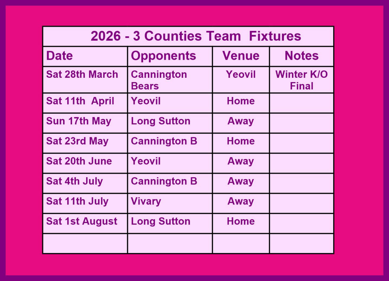 The 2026 3 Counties Team fixtures are shown in the Table. The team is led by Grant Jones and the Vice Captain is Simon Bellamy. The Three Counties league matches are 6 x 4 balls for handicaps of up to 28.