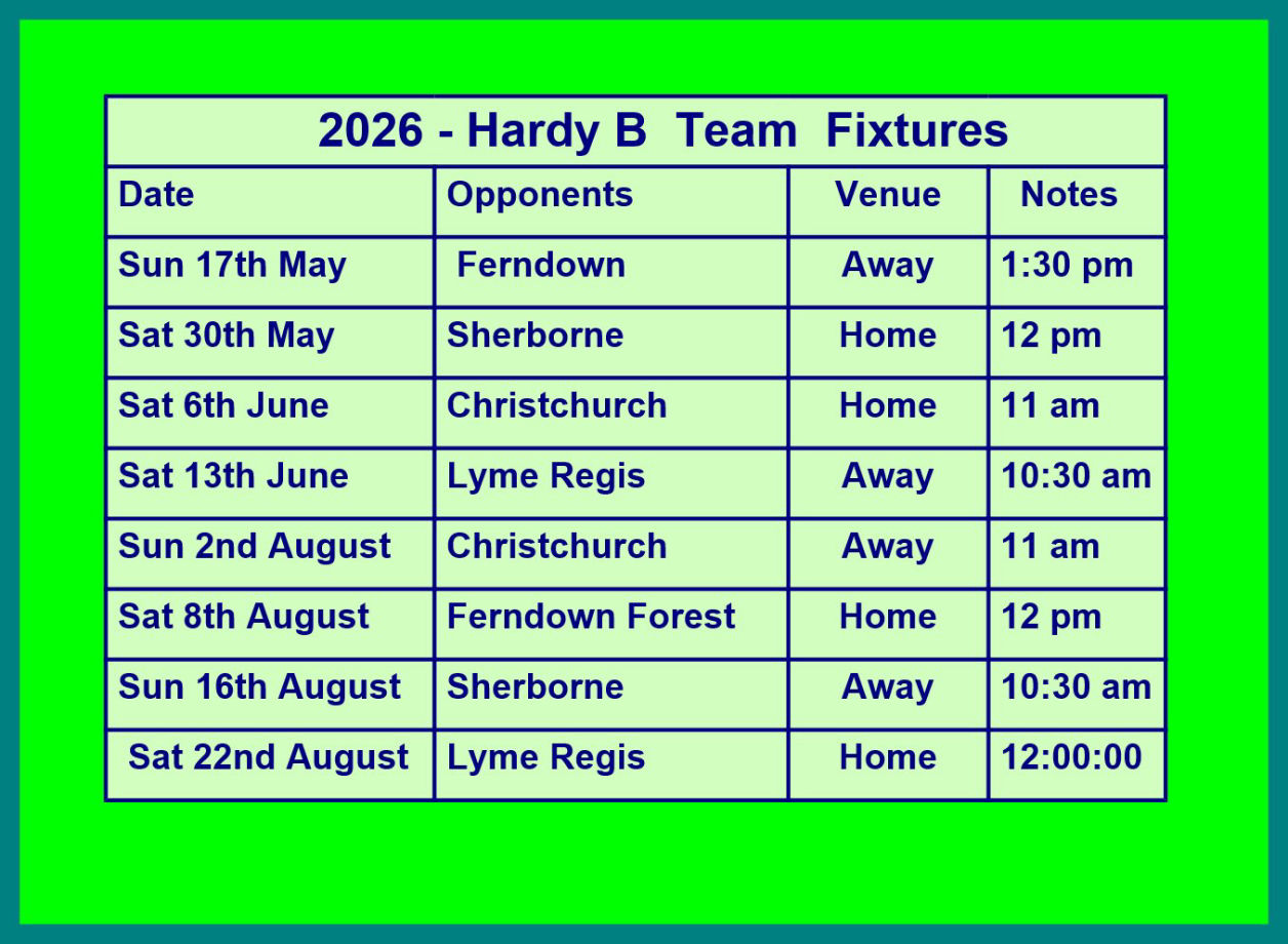 The 2026 team matches for the HARDY B team are shown in the adjacent Table. The team is led by Nigel Bow and the Vice Captain is Reece Lambert. The Hardy B league matches are 5 x 4 balls for players with handicaps of 11 to 18.