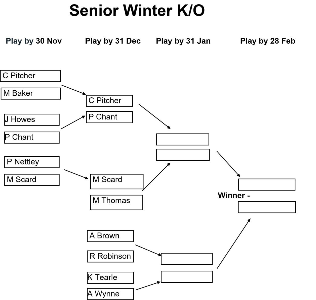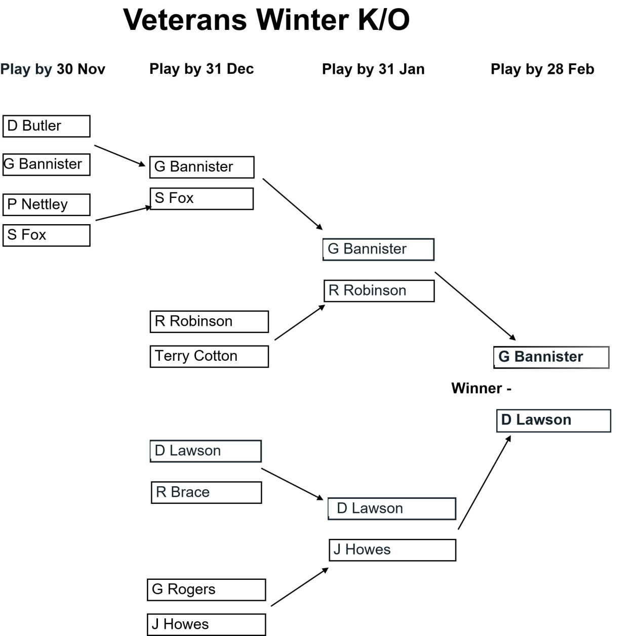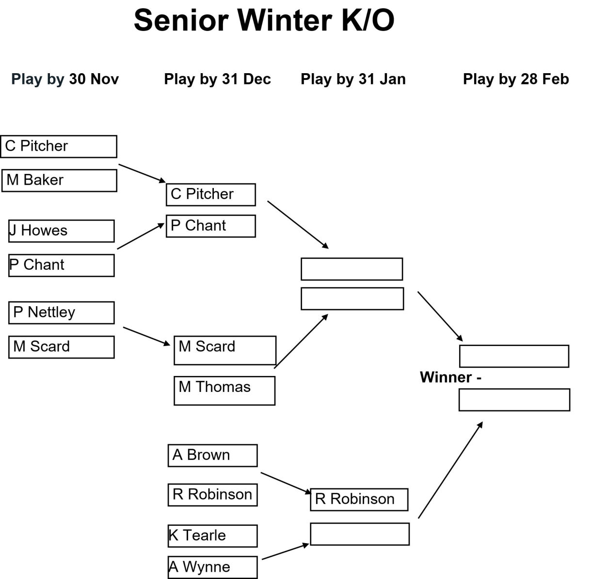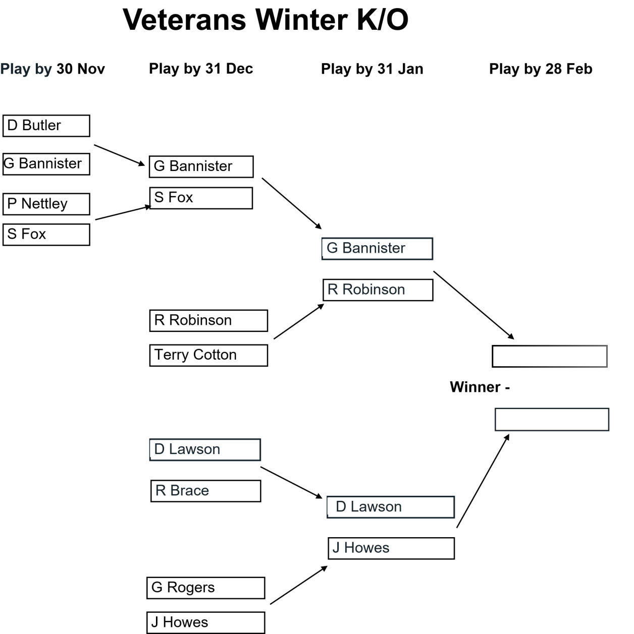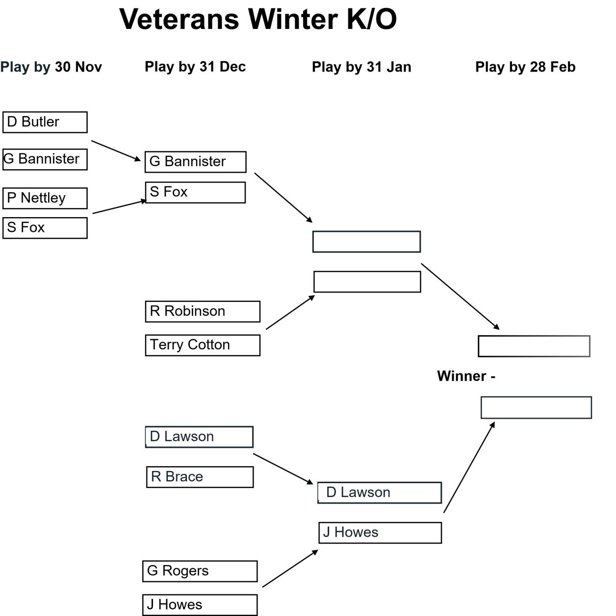 The draw for the Club, Senior, and Veterans Winter Knockouts competitions have been issued and the draws are as shown in the images below together with the Play-by date for each round. Please enter the results of your matches using the form below so that these images can be kept up to date.