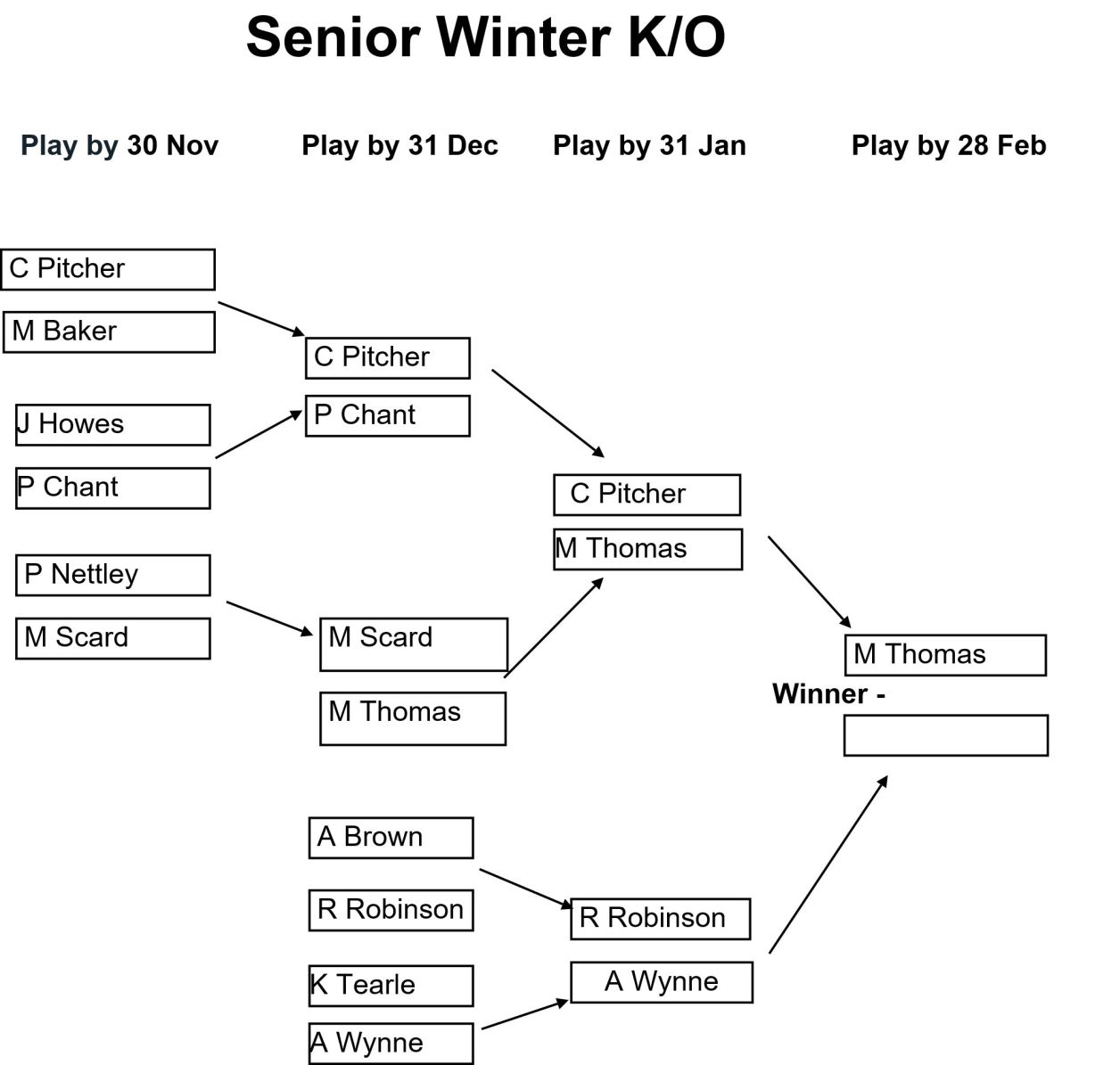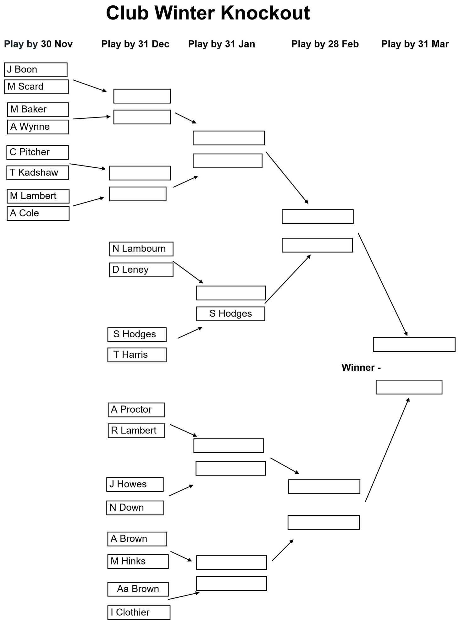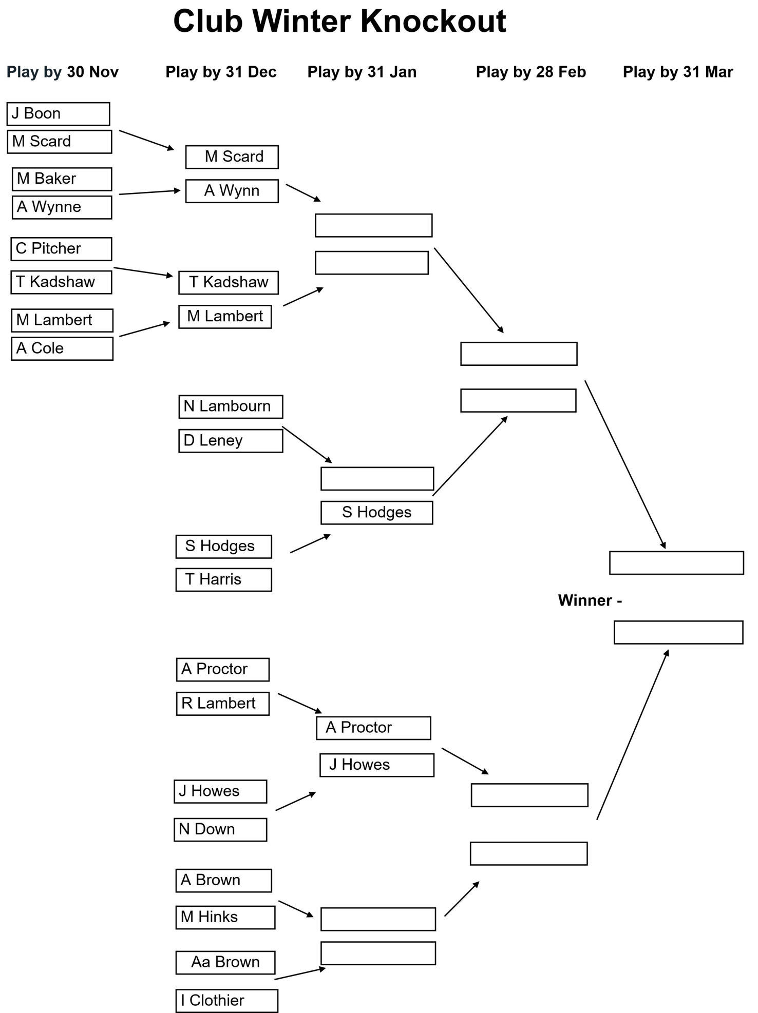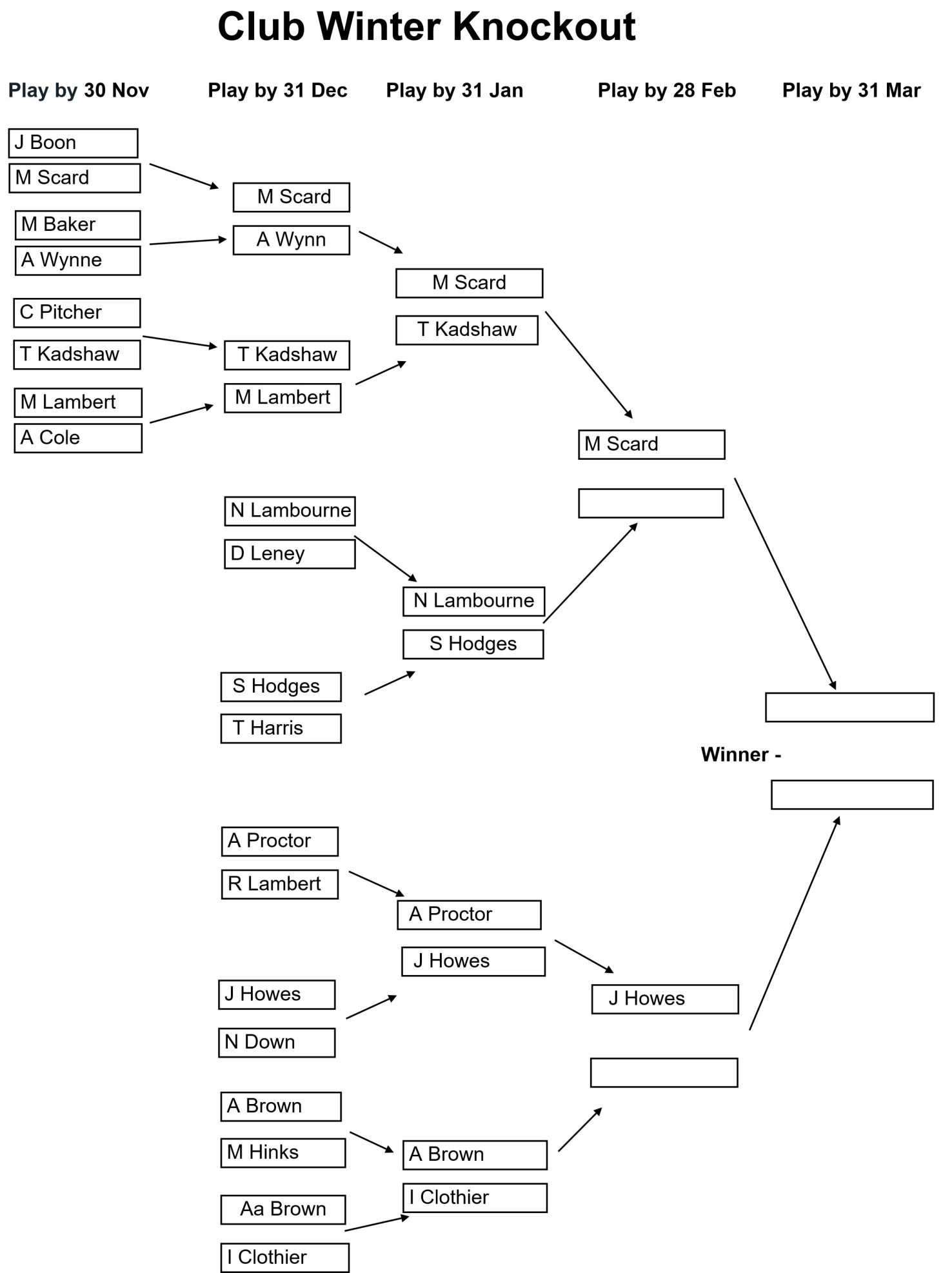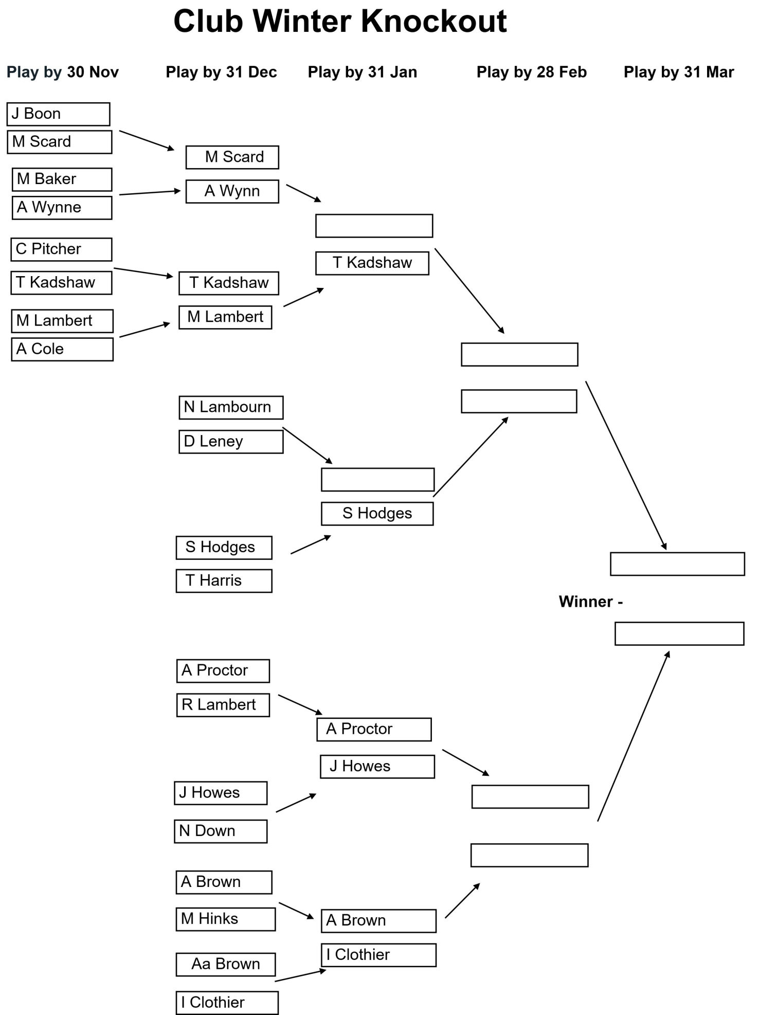 The draw for the Club, Senior, and Veterans Winter Knockouts competitions have been issued and the draws are as shown in the images below together with the Play-by date for each round. Please enter the results of your matches using the form below so that these images can be kept up to date.