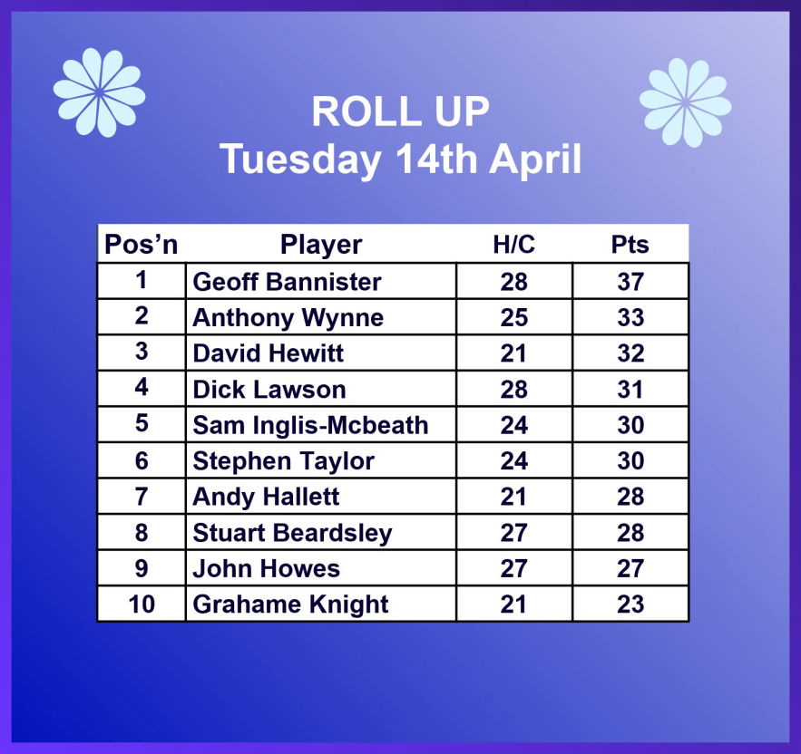 Tuesday 14th April - Roll Up: Won by Geoff Bannister with 37 points. See Table below.