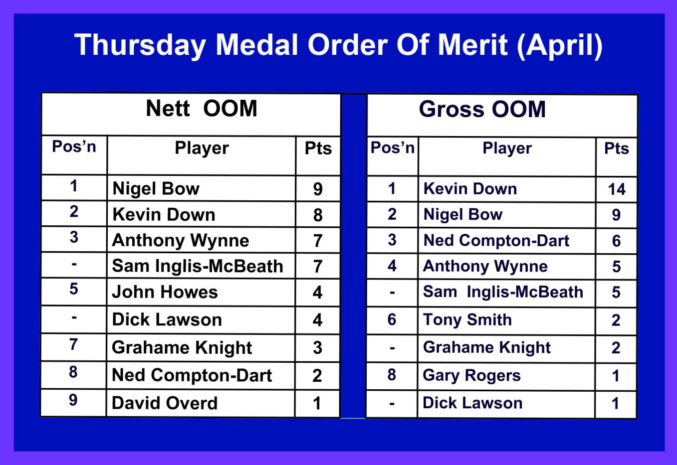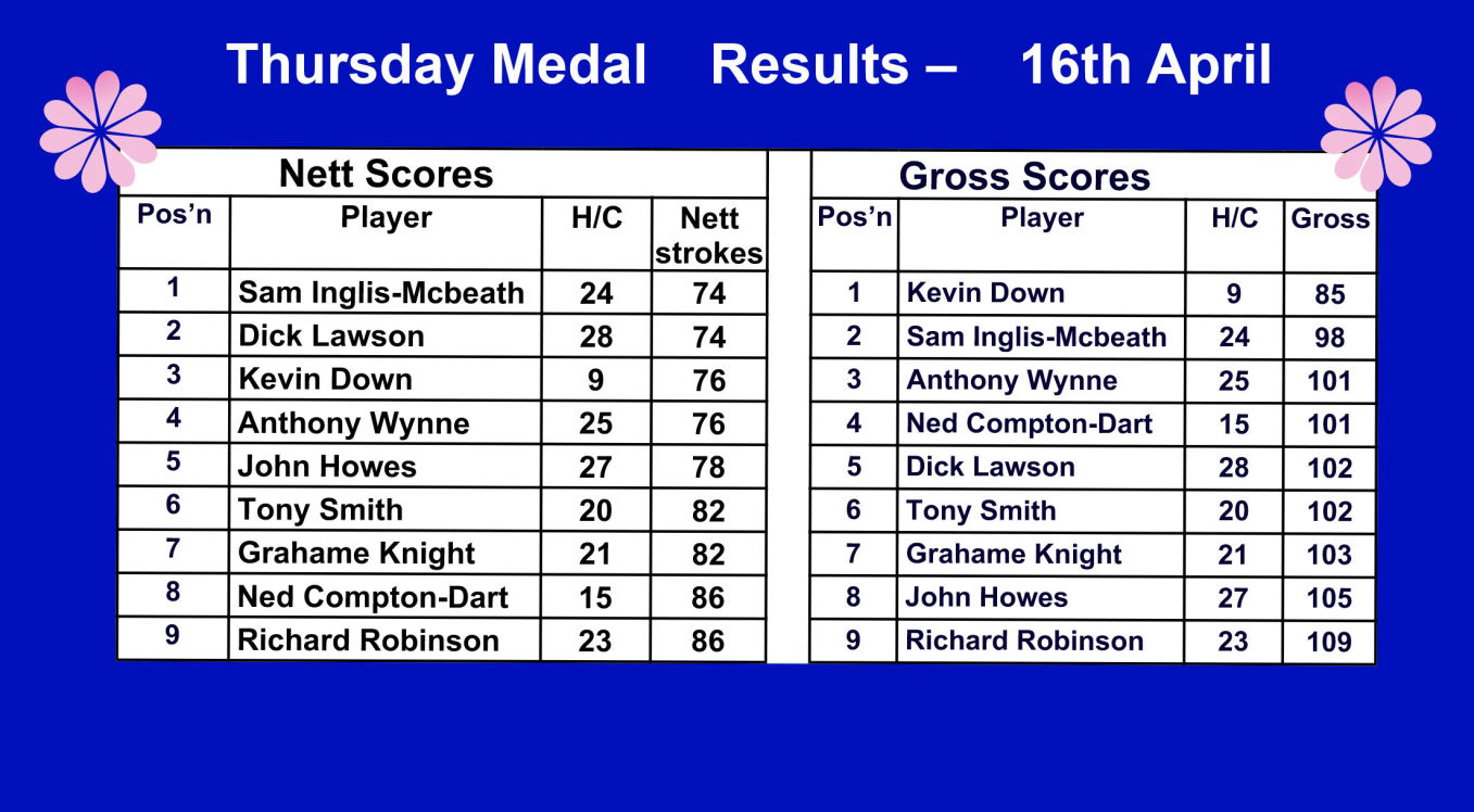 Thursday 16th April - Medal: Won by Sam Inglis-Mcbeath (Nett 74) and Kevin Down (Gross 74). See Results and OOM Tables below.