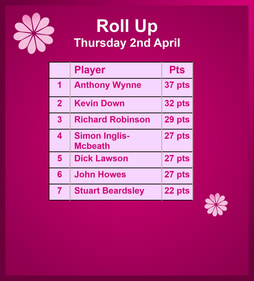 Thursday 2nd April - Roll Up: Won by Anthony Wynne with 37 points.