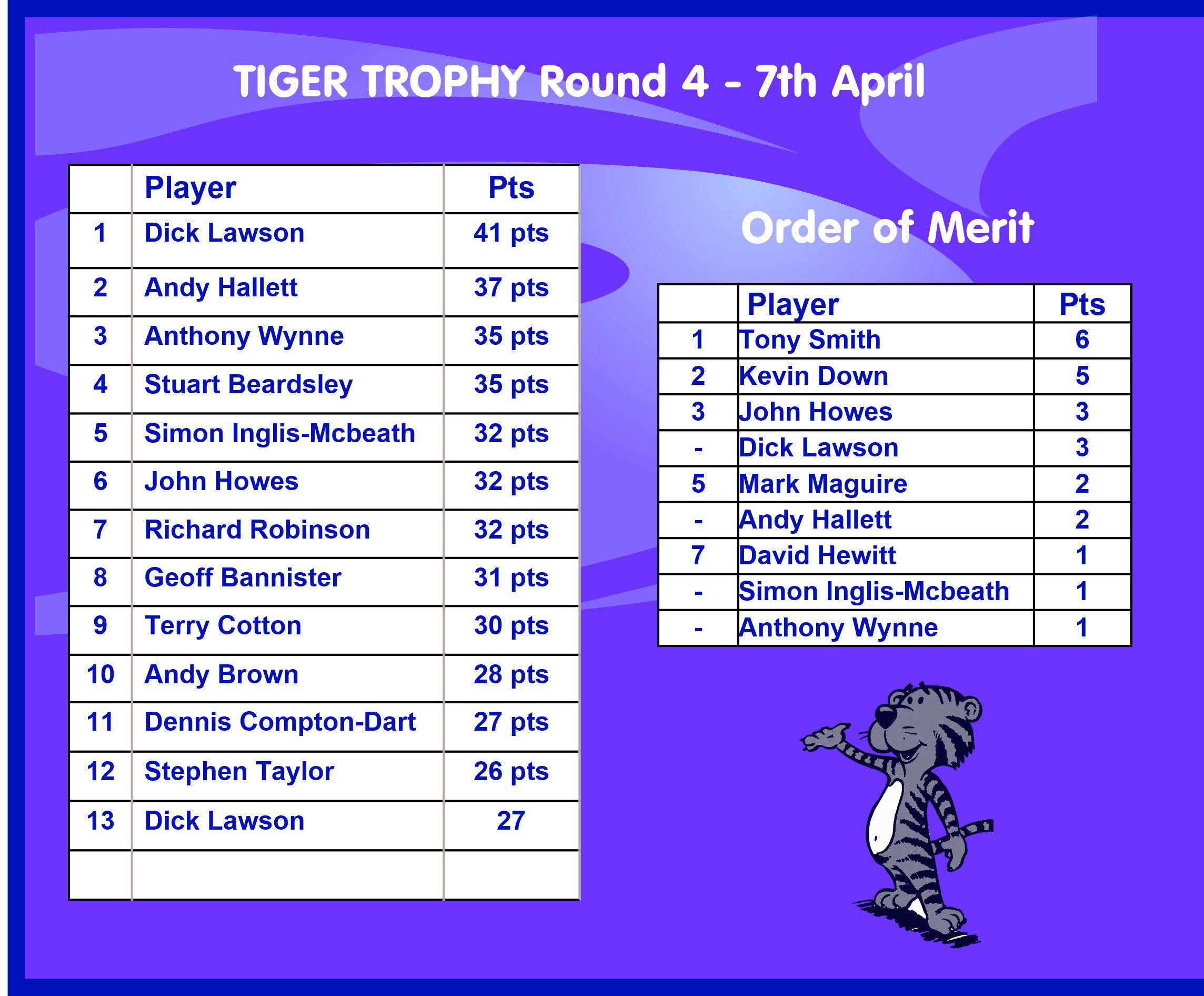 Tuesday 7th April - Tiger Trophy: Won by Dick Lawson with a massive 40 points. See the results and OOM status below.
