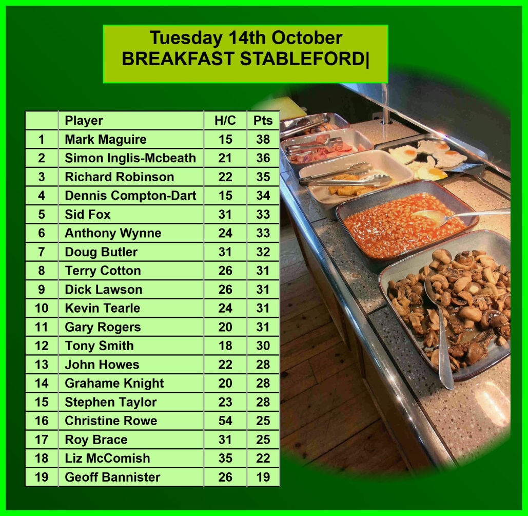 Tuesday 14th October - Breakfast Stableford.: Won by Mark Maguire with 38 points. See Panel and photos below.