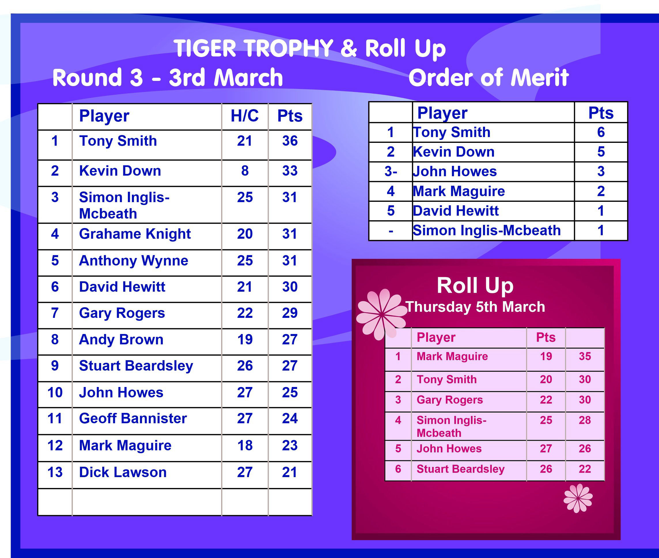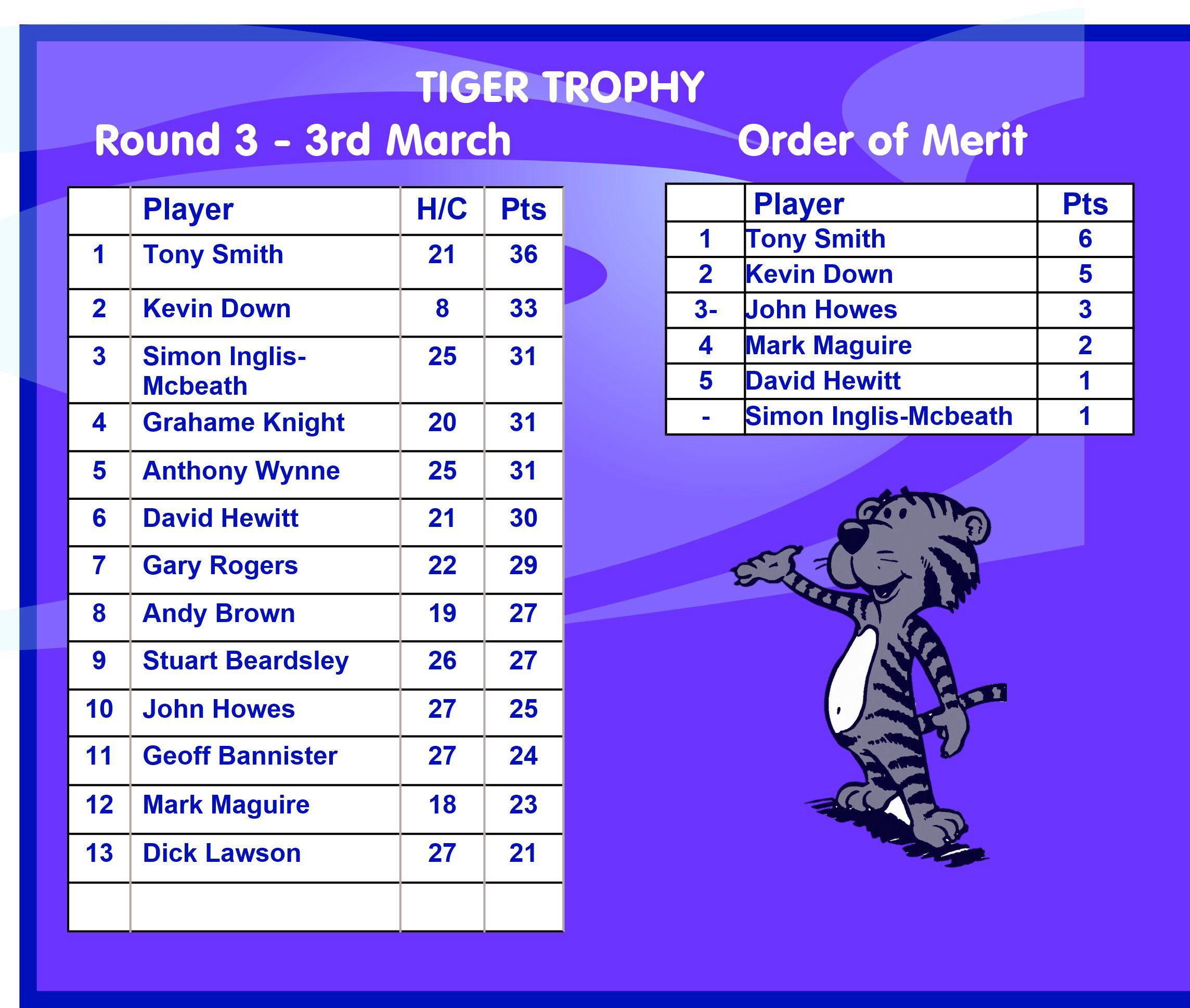 Tuesday 3rd March - Tiger Trophy: Won by Tony Smith with an amazing 36 points! See the Results and OOM tables below.