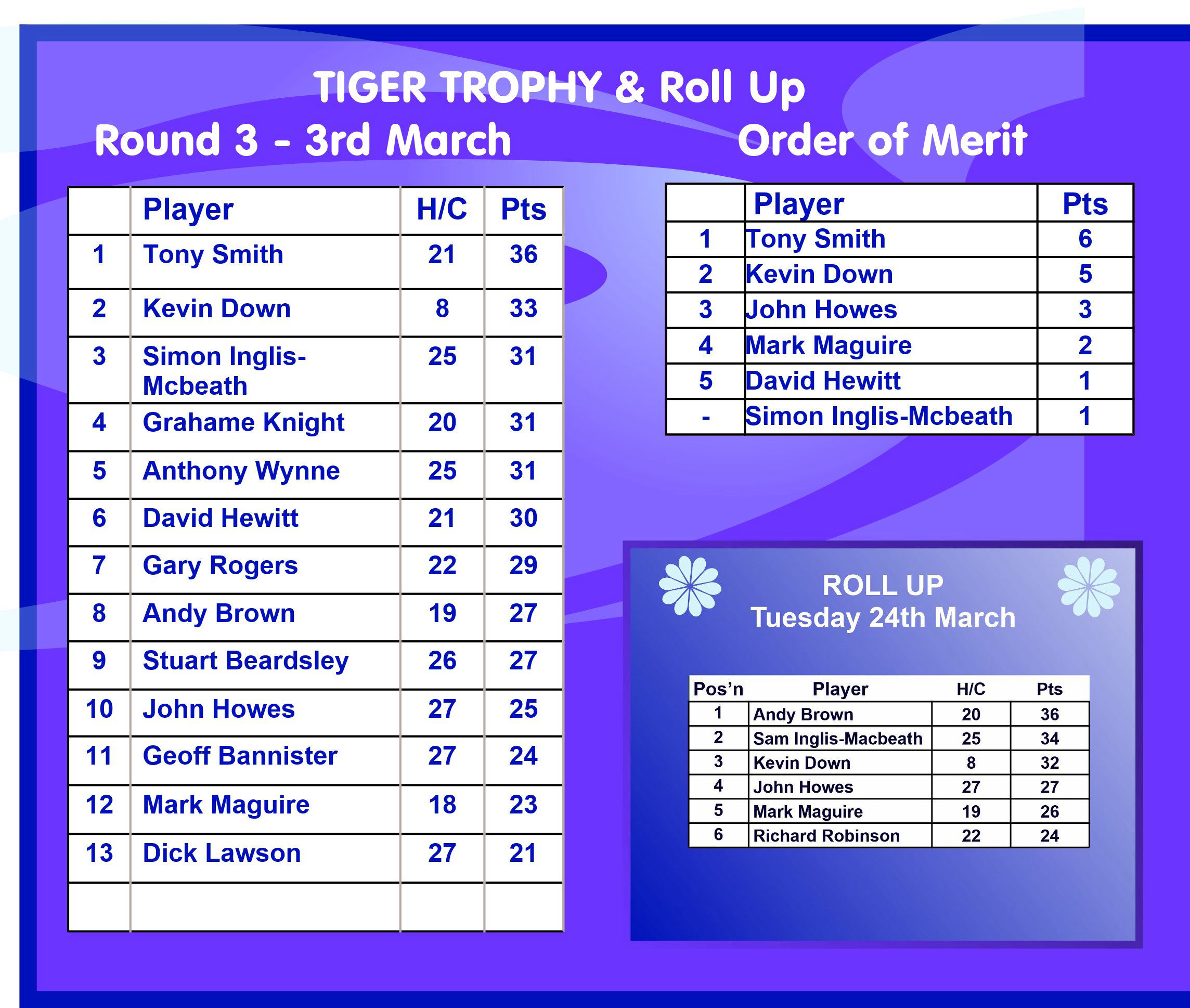 Tuesday 3rd March - Tiger Trophy: Won by Tony Smith with an amazing 36 points! See the Results and OOM the Special Events page..