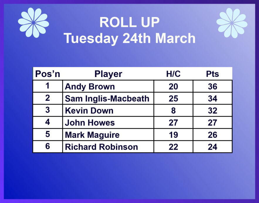 Tuesday 24th March - Roll Up: Won by Andy Brown with 36 points. See Result Table below.