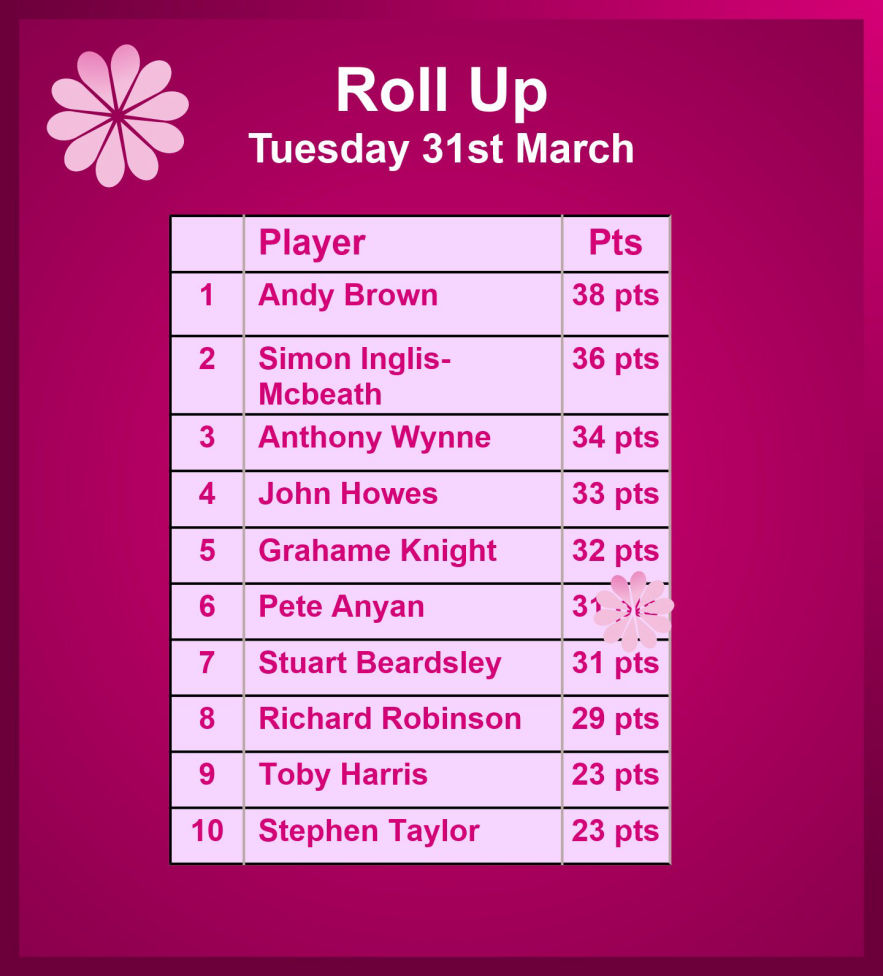 Tuesday 31st March - Roll Up: Won by Andy Brown with 38 points. See the result Table below.