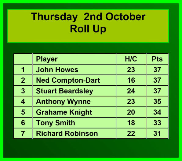 Thursday 2nd October - Roll Up: Won by John Howes with 37 points.