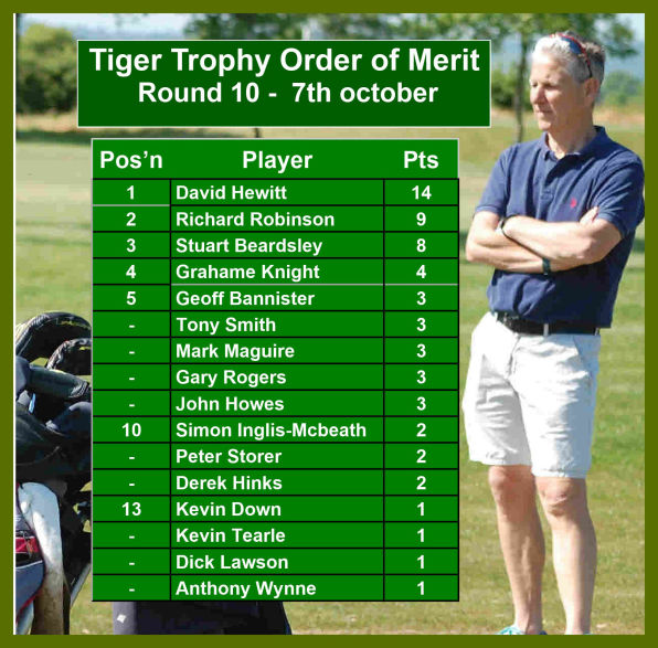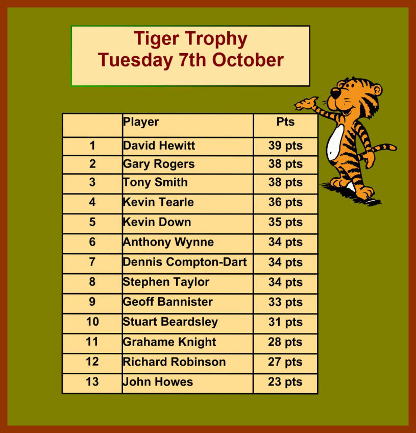Tuesday 7th October - Tiger Trophy: Won by Dave Hewitt with 39 points. See the Results and OOM Tables below.