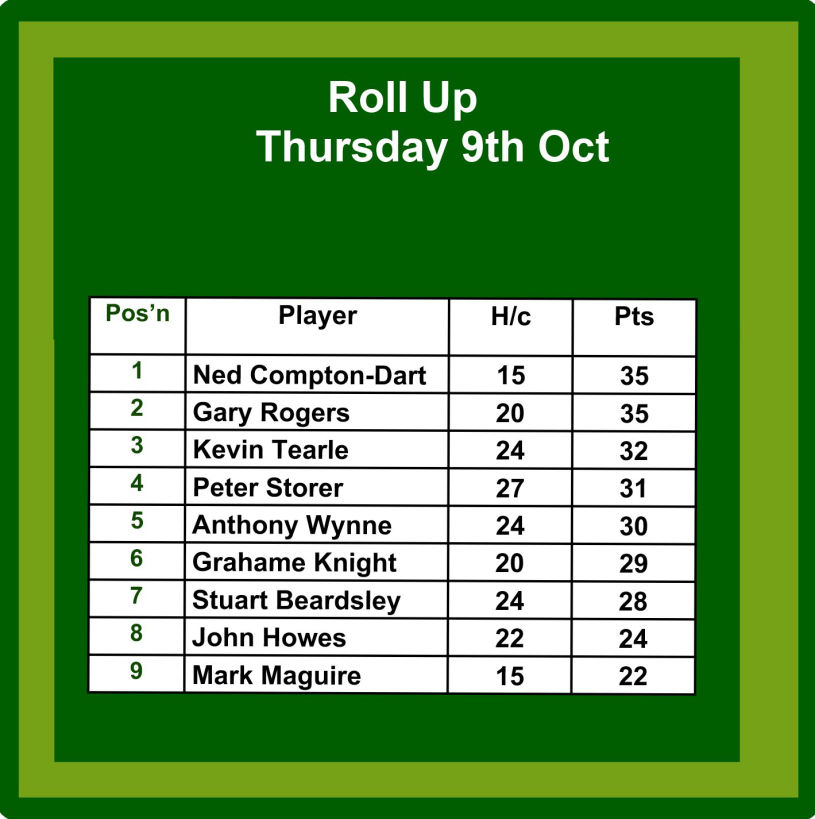Thursday 9th October - Roll Up: Won by Ned Compton-Dart with 35 points. See Result Table below.