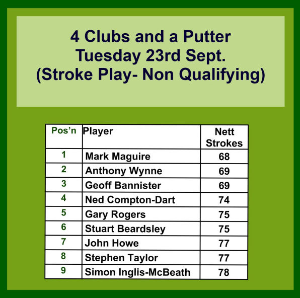 Tuesday 21st October - Roll Up: 4 clubs & Putter. Cards drawn at 8:15 am.