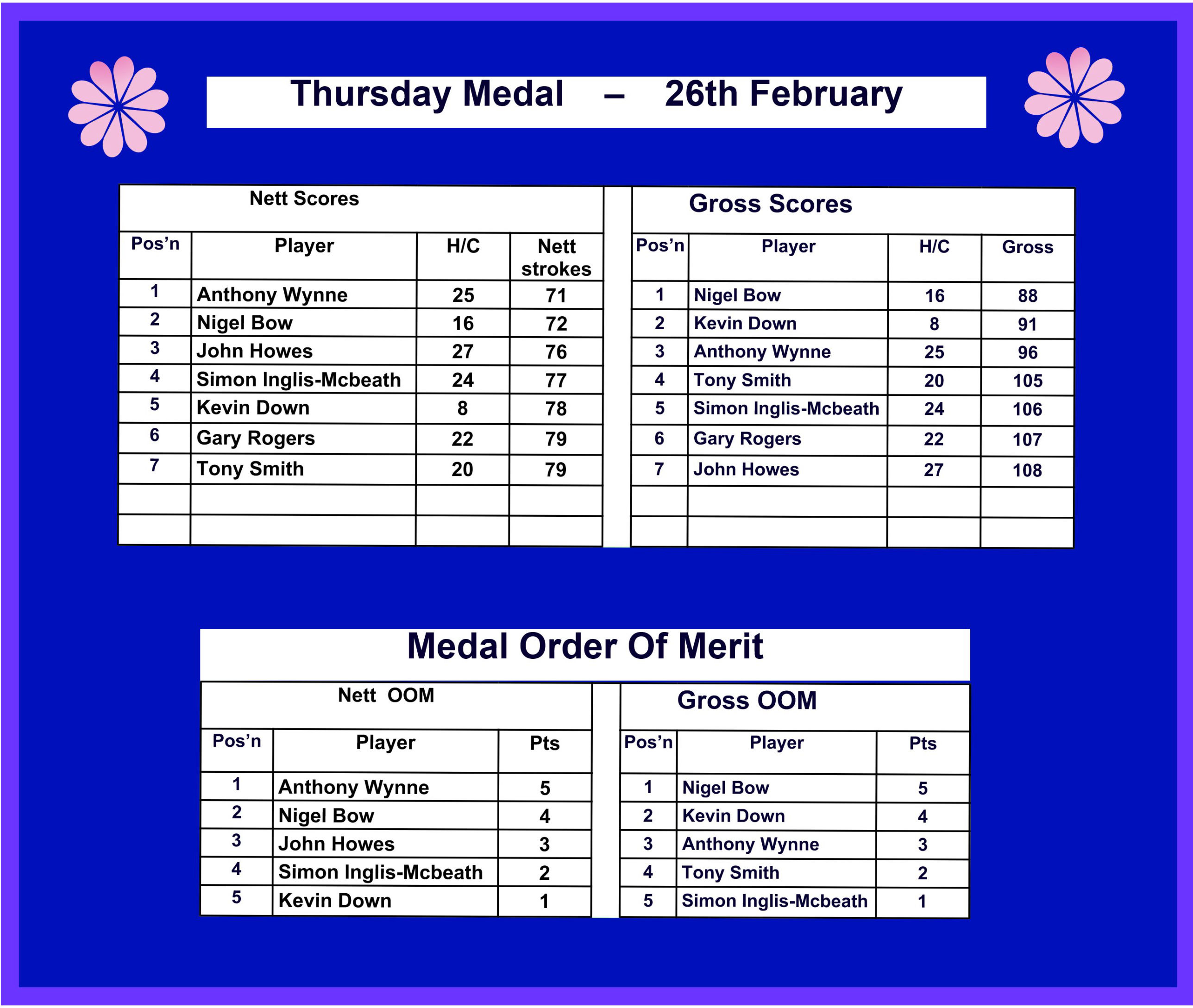 Thursday 26th February - Medal: Won by Tony Wynne (Nett 71) and Nigel Bow (Gross 88). See the panel below for the detailed results and OOMs.