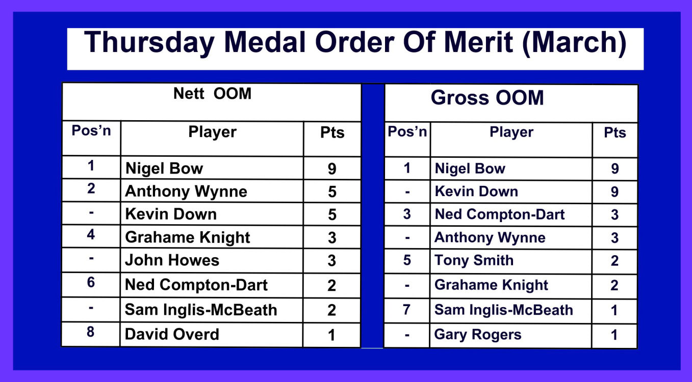 Thursday 19th March - Medal: Won by Nigel Bow (Nett 71) and Kevin Down (Gross 81). See results and Order of Merit Tables below.