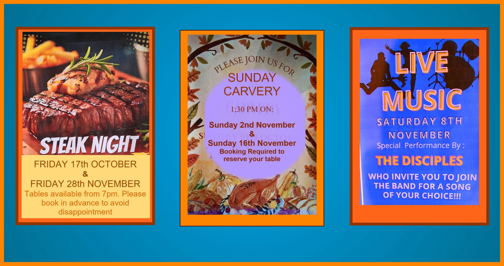 - Steak Nights. Two steak nights are coming up - Friday 17th October and Friday 27th November. Book your table early to reserve your place.
