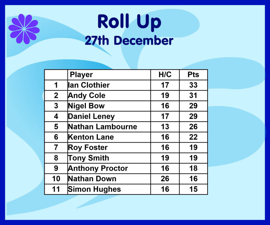 Saturday 27th December - Roll Up: Won by Ian Clothier with 33 points.