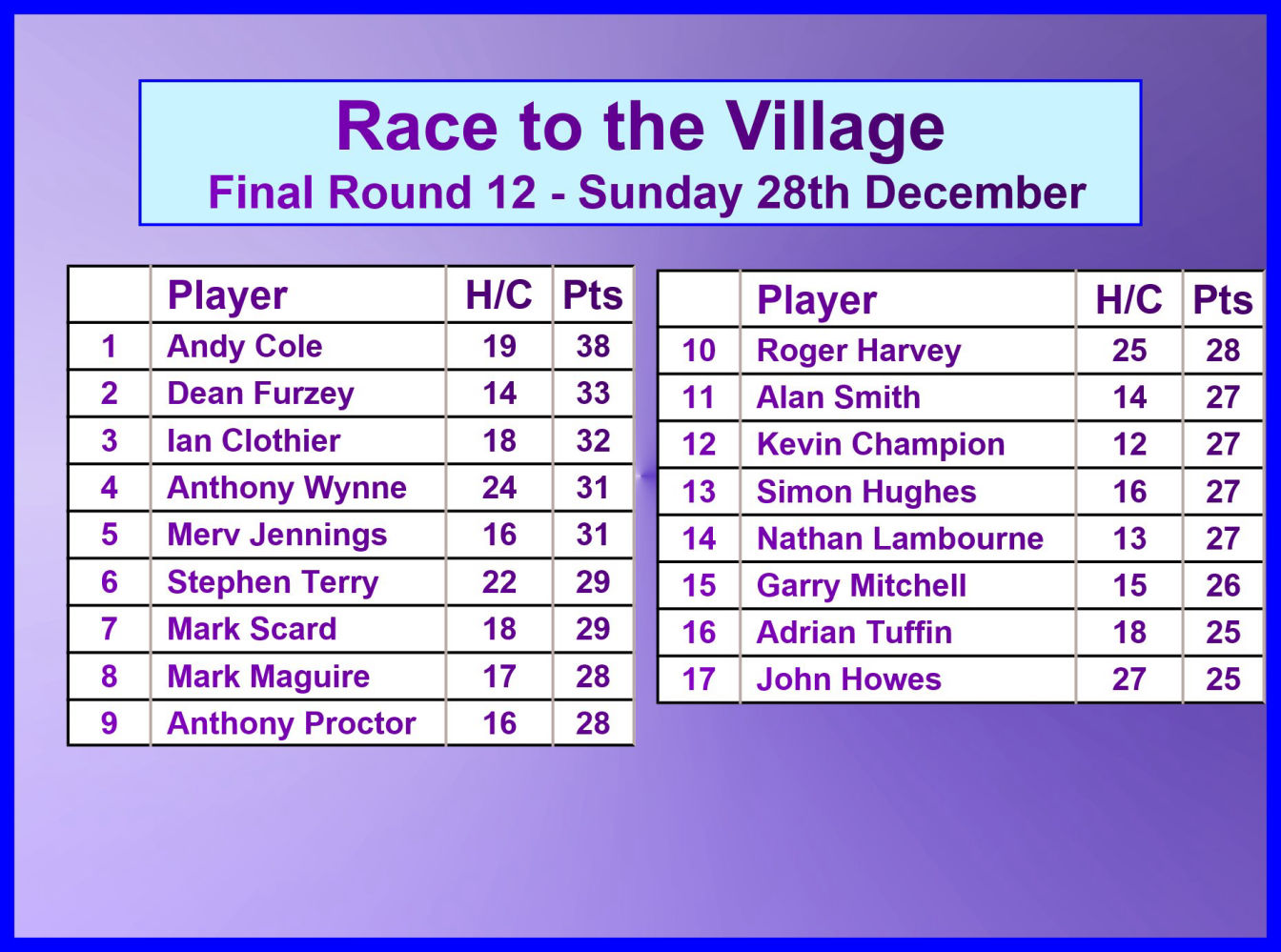 Sunday 28th December - RTTV: Final Round. see Panel below for results.