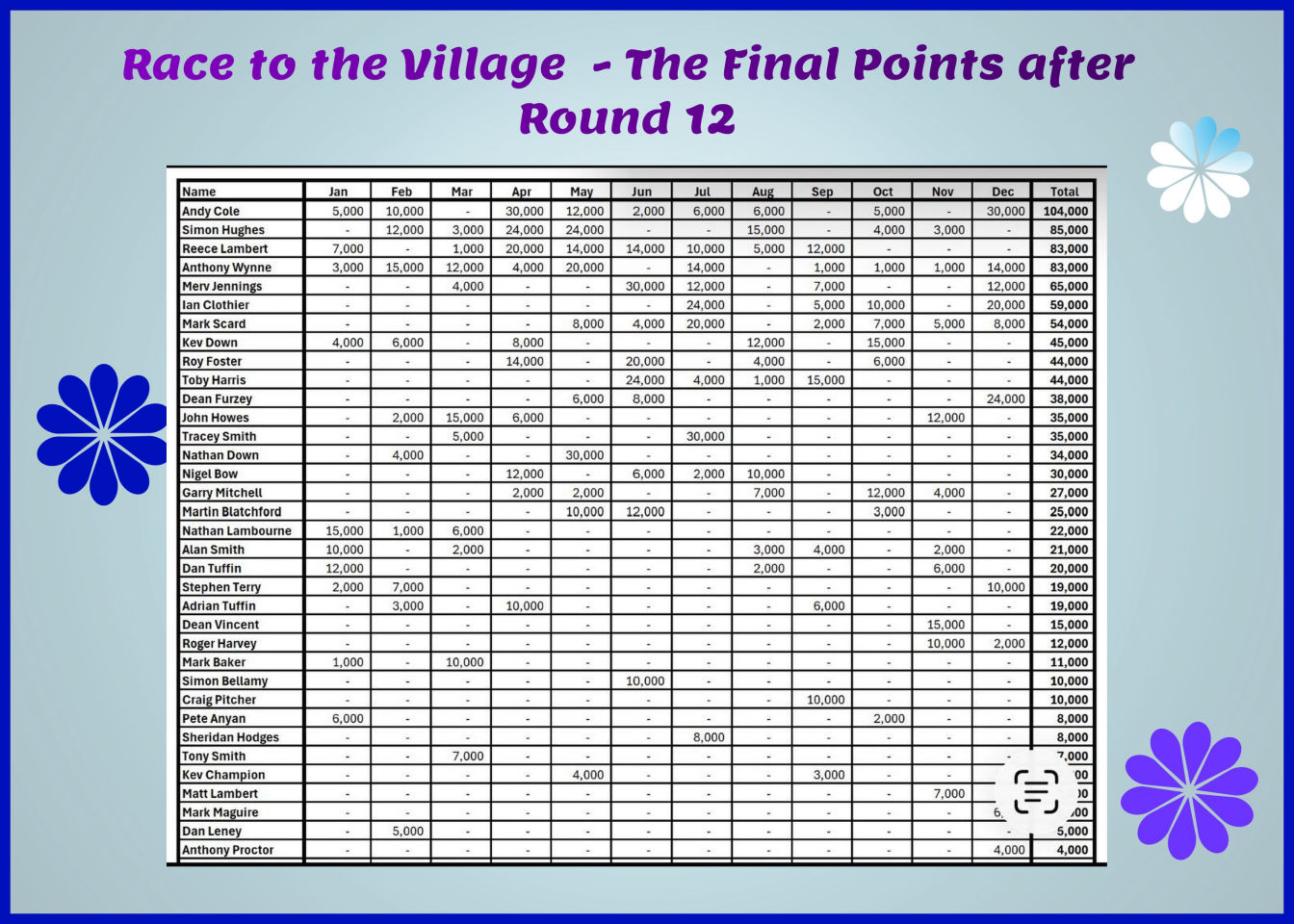 The final RTTV Round 12 took place on Sunday 28th December. Andy Cole won the day - a fitting result for all the effort he has made over the year to run the competition. See the panel below for the detailed results, Andy's Match Report, and the final leader board.