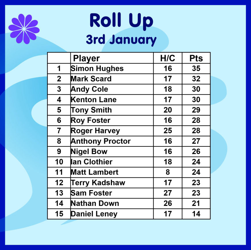Saturday 3rd January - Roll Up: Won by Simon Hughes with 35 points. See Result Table below.