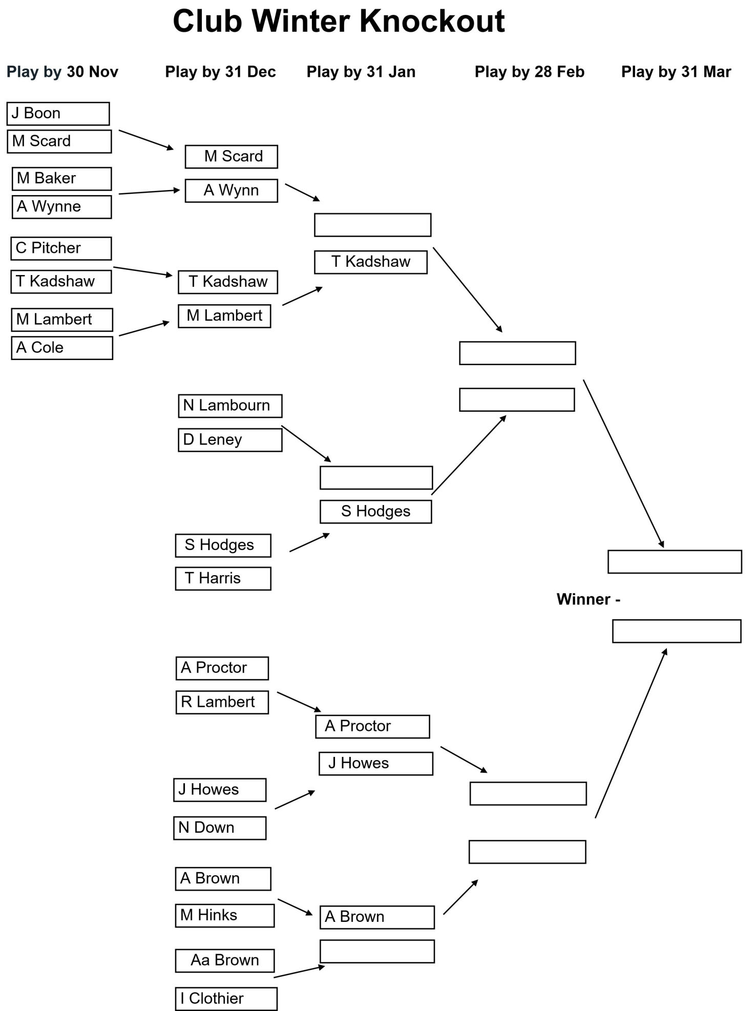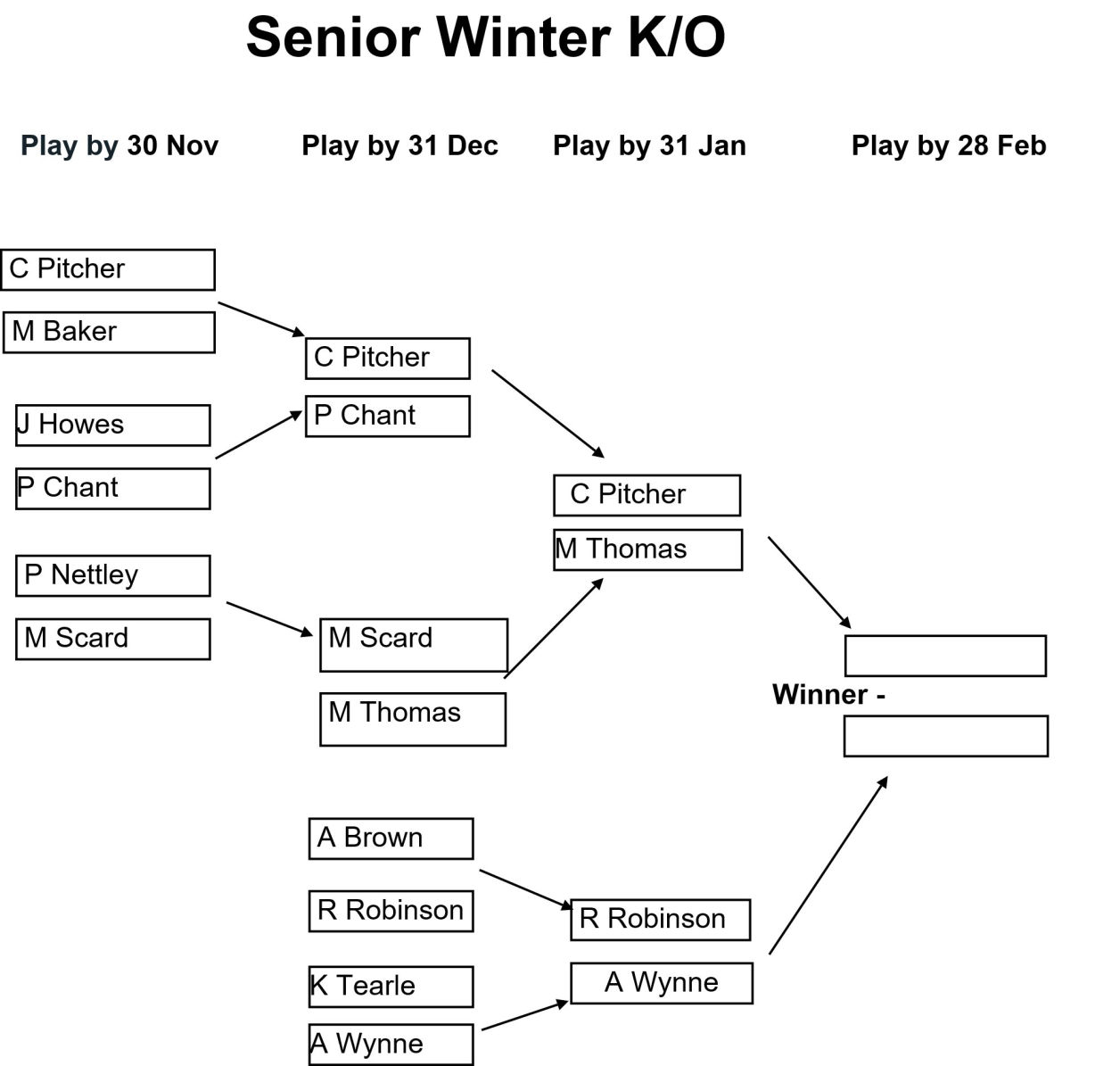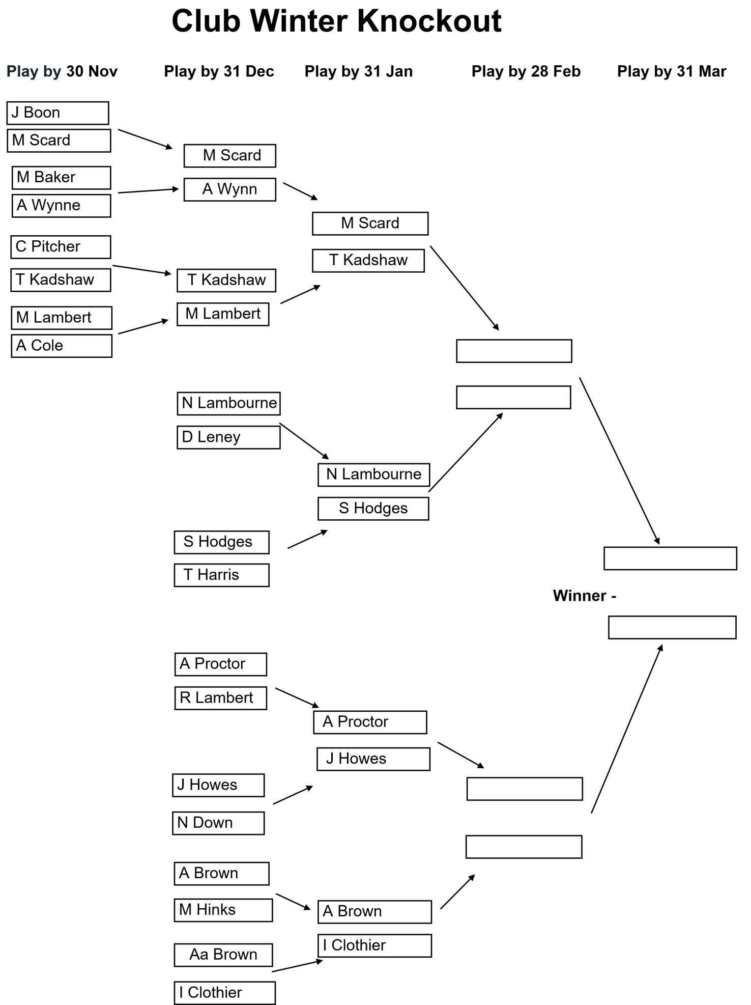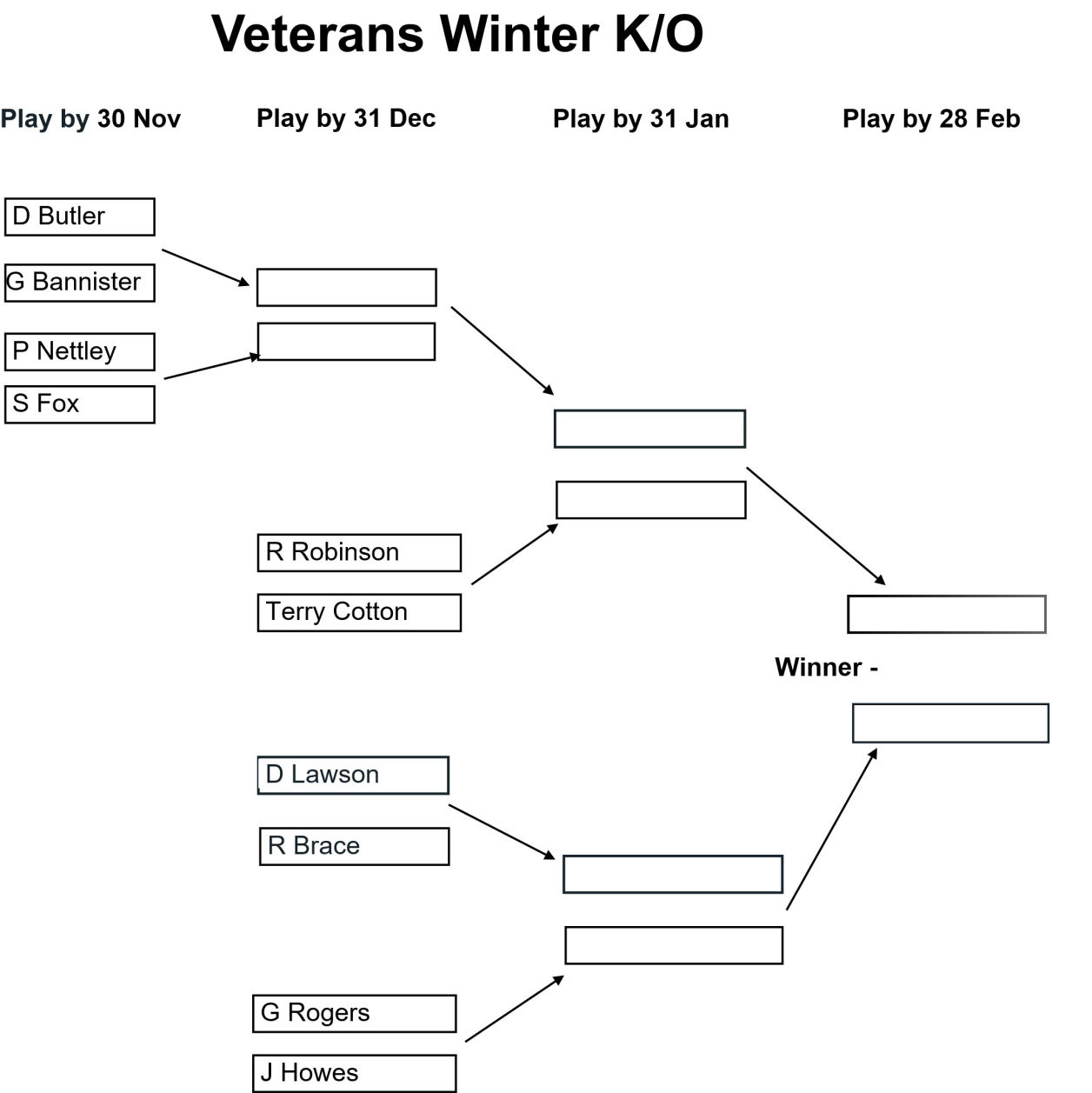 The draw for the Club, Senior, and Veterans Winter Knockouts competitions have been issued and the draws are as shown in the images below together with the Play-by date for each round. Please enter the results of your matches using the form below so that these images can be kept up to date.