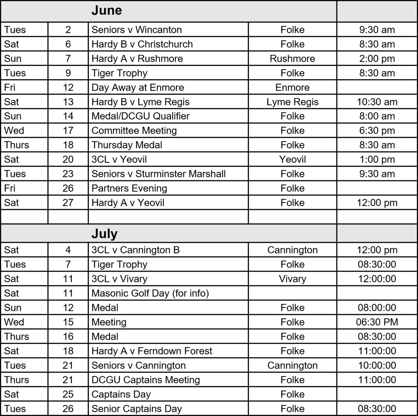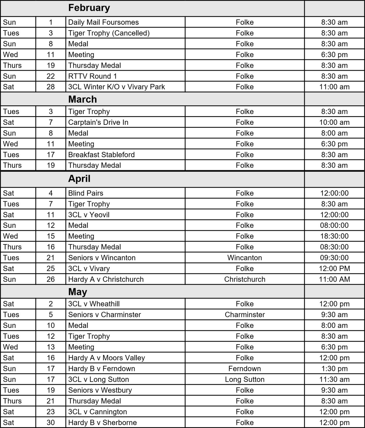 Activities for February to July are shown here and further months will be added shortly. The calendar will be maintained as the year progresses and will include the latest Hardy A, Hardy B, and Three Counties leagues and the Senior Friendlies with other clubs. Internal club competitions and special events will also be shown. Details of the Roll Ups on 'spare' Saturdays, Sundays, Tuesday and Thursdays can be seen on the Special Events and Senior Pages.