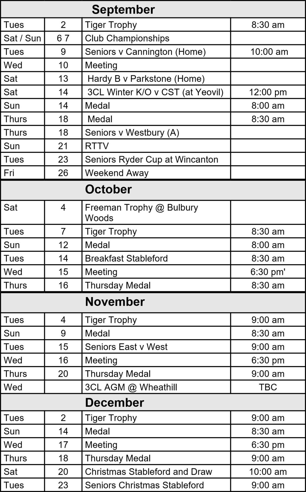 The club calendar shown here will be updated as the months progress. It includes the latest Hardy A, Hardy B, and Three Counties leagues and the Senior Friendlies with other clubs. Internal club competitions and special events will also be shown. Details of the Roll Ups on 'spare' Saturdays, Sundays, Tuesday and Thursdays can be seen on the Special Events and Senior Pages.